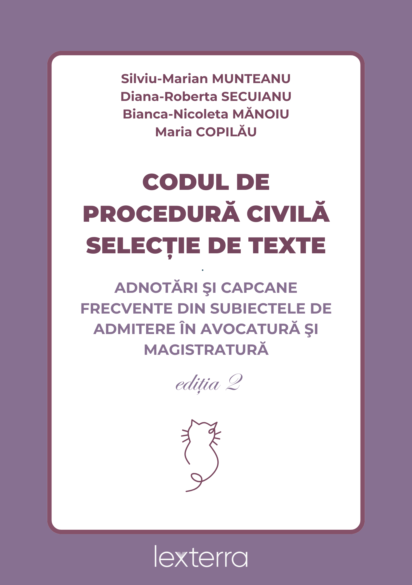 ATENTIE! Lucrarea conține selecții ale textelor din Codul de procedură civilă, respectiv textele care corespund tematicilor de examen aprobate prin Hotărârea Consiliului UNBR nr. 208 din 12 iunie 2025 privind organizarea examenului de primire în profesie – sesiunea septembrie 2025 și prin tematica pentru susținerea concursului de admitere la Institutul Național al Magistraturii 2024-2025 – cărțile nu cuprind textele de lege care NU intră în programele amintite.