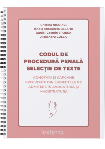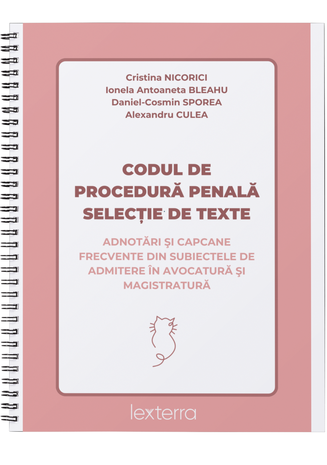 ATENTIE! Lucrarea conține selecții ale textelor din Codul de procedură penală, respectiv textele care corespund tematicilor de examen aprobate prin Hotărârea Consiliului UNBR nr. 208 din 12 iunie 2025 privind organizarea examenului de primire în profesie – sesiunea septembrie 2025 și prin tematica pentru susținerea concursului de admitere la Institutul Național al Magistraturii 2024-2025 – cărțile nu cuprind textele de lege care NU intră în programele amintite.