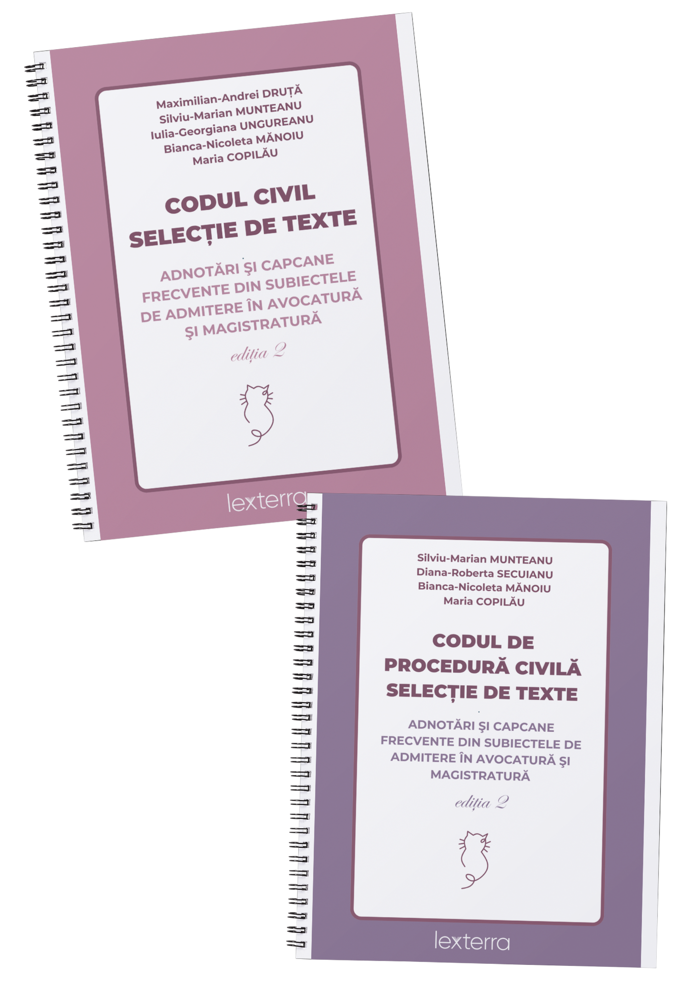 Cele două lucrări își propun să vină în sprijinul candidaților care se pregătesc pentru examenele de admitere în profesiile juridice, prin (i) selectarea textelor legislative incluse în bibliografia aferentă examenelor de admitere în profesia de avocat, respectiv la Institutul Național al Magistraturii și în magistratură și (ii) adnotarea textelor de lege cu observații teoretice formulate inclusiv pe baza subiectelor de la examenele din anii anteriori.