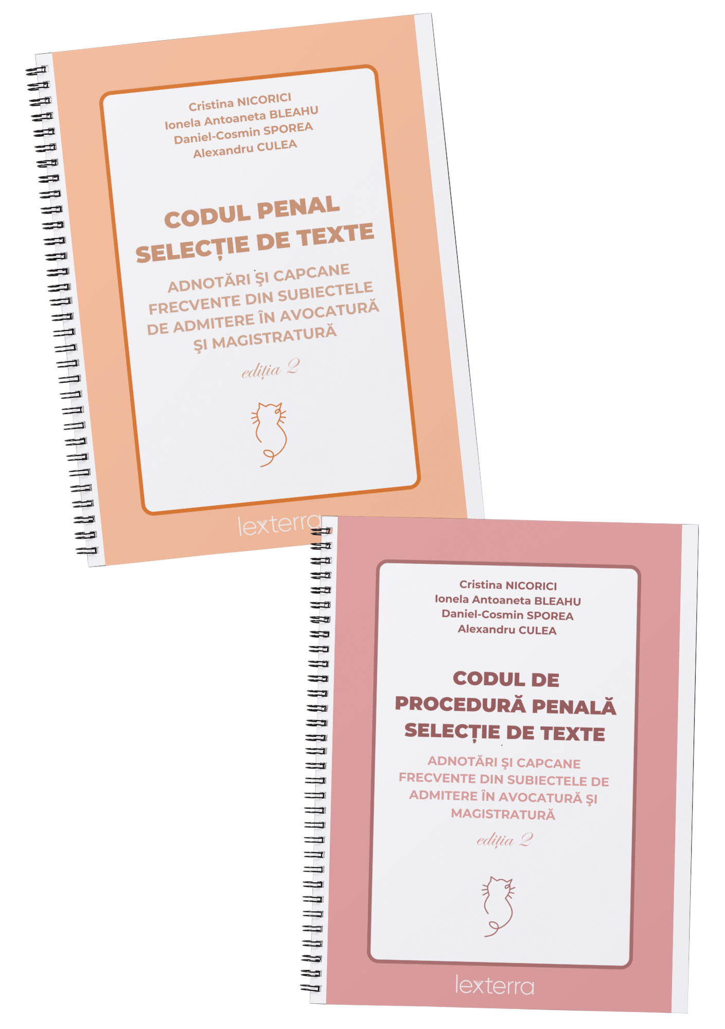ATENTIE! Lucrările din pachet conțin selecții ale textelor din codurile legislative, respectiv textele care corespund tematicilor de examen aprobate prin Hotărârea Consiliului UNBR nr. 208 din 12 iunie 2025 privind organizarea examenului de primire în profesie – sesiunea septembrie 2025 și prin tematica pentru susținerea concursului de admitere la Institutul Național al Magistraturii 2024-2025 – cărțile nu cuprind textele de lege care NU intră în programele amintite.